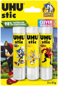 UHU c’est associĂ© Ă Sonic pour cette rentrĂ©, aprĂšs Mario ou PokĂ©mon c’est toujours un succĂšs. Et inutile de vous en faire des pages, cĂŽtĂ© colle rien ne sert d’essayer de faire des Ă©conomies puisque le pas chĂšre coute chĂšre : les bĂątons de colles 1er prix ne collent pas, sĂšchent vite, se consomment vite et se rachĂštent trop vite, au final, ils reviennent plus chĂšres qu’un bĂąton de colle UHU qui est probablement le meilleur du marchĂ© !