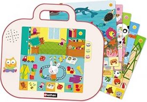 Mon premier dokéo – Nathan : Cà n’est pas tout à fait un livre mais c’est encore mieux, une encyclopédie ! Elle est parlante et tout de même facile à transporter partout ! Elle va accompagner l’enfant dans ses premières découvertes tout en l’éveillant au plaisir des images, des mots et des sons.24 grandes scènes vivantes et 500 mots illustrés vont le plonger dans des univers proches de son quotidien. 3 niveaux de difficulté permettent d’accompagner l’enfant progressivement dans ses premiers apprentissage. PVC 34.99€