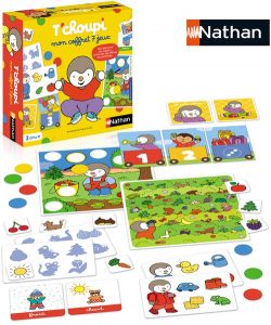 T’choupi Mon coffret 7 jeux – Nathan : Ce coffret complet dans l’univers de T’choupi propose 7 jeux variés qui permet d’éveiller la curiosité des tout-petits et les stimuler autour d’un de leur compagnon favori, T’choupi. Les règles sont simples et adaptées, et permettent d’aborder en douceur les formes, les couleurs, les chiffres, les émotions, les contraires … PVC 21.99€