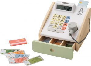 Caisse enregistreuse – Lidl : On aime beaucoup les jouets en bois Lidl et notamment cette caisse enregistreuse, parfaite pour éveiller les petits. Équipée de touches colorées, de fausse monnaie et de cartes de crédit miniatures, cette réplique de caisse enregistreuse permet aux petits commerçants en herbe de développer leurs compétences en calcul de façon ludique. Les enfants apprennent les notions d’achat, de vente et d’échange en jouant avec leurs amis et leur famille. PVC 8.99€