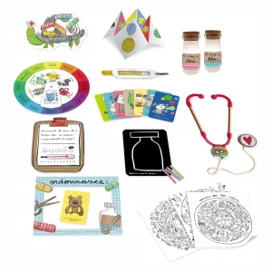 La Malette du Dr des Emotions – Nathan : On aime toujours quand il s’agit d’apprivoiser, reconnaître et découvrir ses émotions à travers le jeu, et cette mallette propose une approche ludique et progressive pour accompagner l’enfant au quotidien. Elle comprend plus de 10 activités variées permettant une exploration en douceur de son univers émotionnel. S’inspirant de l’univers bienveillant du monstre des couleurs, elle offre des outils concrets encourageant l’expression des ressentis. A l’aide des différents « remèdes » proposés — fiche de diagnostic, thermomètre des émotions, roulette du bien-être, stéthoscope, mandalas à colorier… — l’enfant apprend à reconnaître, comprendre et partager ses émotions avec sérénité. Véritable allié du développement personnel, ce jeu l’invite à identifier et apprivoiser ses émotions à son rythme, tout en renforçant sa confiance en lui. PVC 31.99€