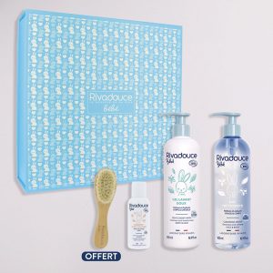 Rivadouce : Il existe plusieurs coffrets adaptés à différents budgets, et c’est une gamme qu’on adore pour les bébés. Vous trouverez notamment le coffret Mon 1er Coffret de naissance composé des indispensables certifiés Bio pour une routine hygiène et soin complète dès la sortie de la maternité : 1 Gel lavant doux Bébé 500ml, 1 Eau nettoyante Bébé 500ml, 1 Liniment oléo-calcaire Bébé 75ml et une brosse bébé en bois offerte. Le tout dans une jolie boîte, décorée de deux rubans, réutilisable grâce à sa fermeture aimantée.