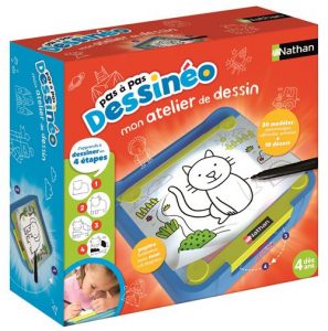Dessinéo Mon atelier dessin – Nathan : Avec cette plateforme lumineuse intuitive, les enfants découvrent dès 4 ans le plaisir du dessin en toute autonomie. Grâce à divers modèles simples décomposés en 4 étapes, ils apprennent à structurer leurs gestes et à créer en toute confiance. Le coffret inclut une plateforme compacte et légère, un feutre noir, 30 modèles de dessins, 10 décors variés et un livret explicatif. Facile à utiliser, elle valorise chaque progrès et fait du dessin une activité à la fois ludique, éducative et gratifiante. Dessiner étant l’occupation préférée des 4-8 ans, cet atelier est l’outil idéal pour stimuler l’imaginaire et accompagner les artistes en herbe dans leurs premières créations. 39.99€