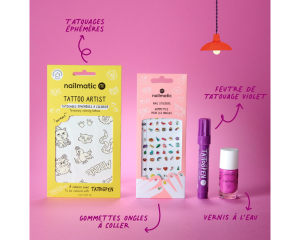 Magic Box – Nailmatic Kids : Une box un peu plus complète pour les petits curieux en quête de fun ! La coffret contient 2 bombes de bain, 1 Pataploof Pâte à modeler lavante, 2 Planches de Tattoo, 1 feutre tattoo et 1 jeu de 7 familles ! 30€